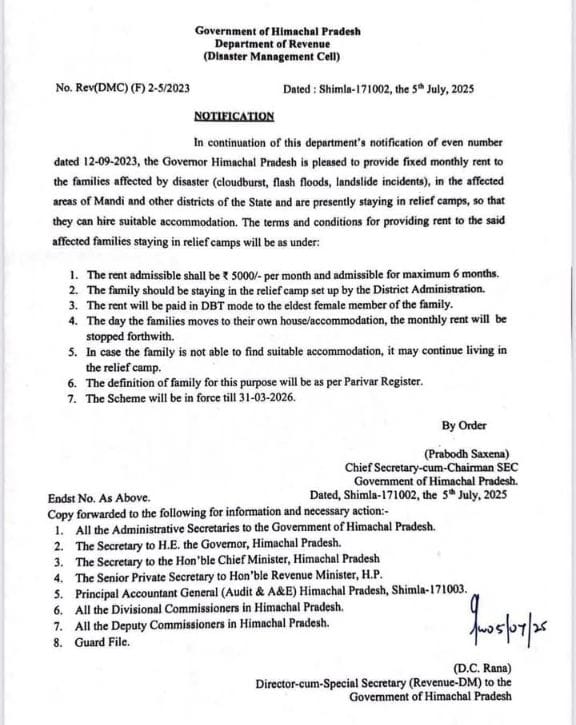 प्रदेश सरकार ने आपदा प्रभावित क्षेत्र के उन लोगों को प्रतिमा ₹5000 मकान का कराया देने की घोषणा की थी, जिसकी शनिवार को नोटिफिकेशन जारी कर दी है। इस स्कीम के तहत प्रभावित परिवारों को 31 मार्च 2026 तक प्रतिमाह ₹5000 मिलेगा।