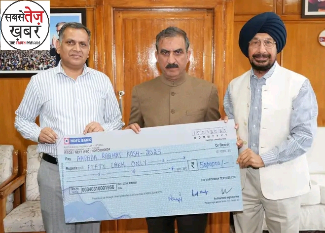 Baddi-based Vardhman Group Chairman and Director Indra Mohan Singh Sidhu presented a financial aid of Rs 50 lakh to Chief Minister Thakur Sukhvinder Singh Sukhu for the Chief Minister’s Disaster Relief Fund. This amount will be used for rehabilitation and relief work of families affected by recent disasters in the state. Chief Minister Sukhu appreciated this humanitarian initiative of Vardhman Group and thanked Indra Mohan Singh Sidhu. He said that this amount will prove helpful in providing support and relief to the disaster affected people. Vardhman Group Vice President (Corporate Affairs) Atul Bhardwaj was also present on this occasion. The Chief Minister also thanked him for participating in this noble work.