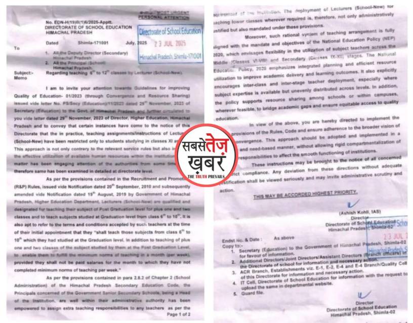 हिमाचल प्रदेश शिक्षा निदेशालय ने सरकारी वरिष्ठ माध्यमिक विद्यालयों के लिए एक महत्वपूर्ण दिशा-निर्देश जारी किया है। अब लेक्चरर (स्कूल न्यू) केवल 11वीं और 12वीं तक ही सीमित नहीं रहेंगे, बल्कि उन्हें कक्षा 6 से 12 तक के विद्यार्थियों को शिक्षण कार्य करना होगा। शिक्षा निदेशक आशीष कोहली ने जानकारी देते हुए बताया कि यह बदलाव राष्ट्रीय शिक्षा नीति 2020 की भावना के अनुरूप है, जिसका उद्देश्य विद्यार्थियों को समग्र, सुदृढ़ और गुणवत्तापूर्ण शिक्षा उपलब्ध करवाना है।