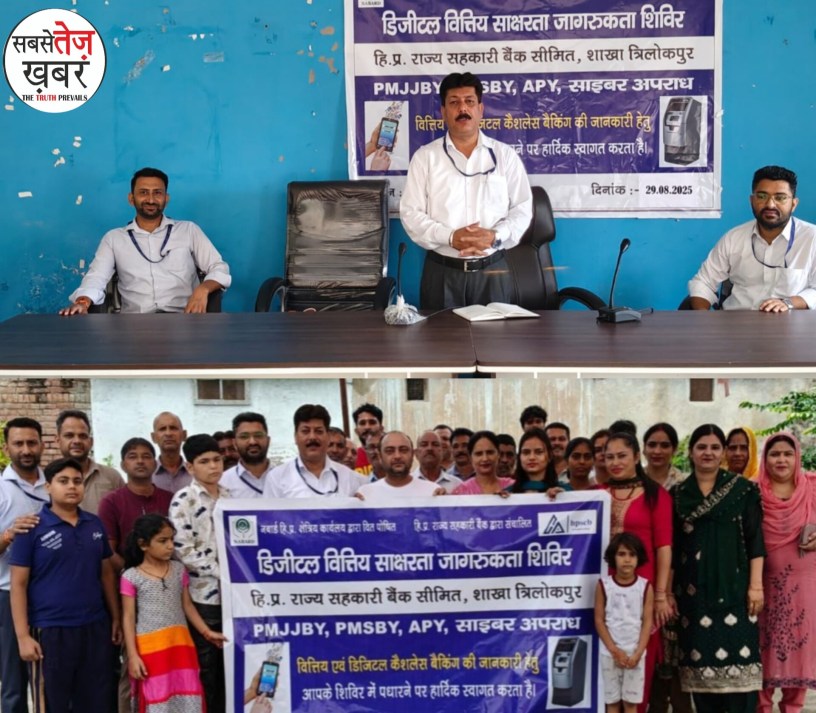 हिमाचल प्रदेश राज्य सहकारी बैंक की त्रिलोकपुर शाखा द्वारा NABARD के सौजन्य से ग्राम पंचायत भवन त्रिलोकपुर में एक दिवसीय डिजिटल वित्तीय साक्षरता शिविर का आयोजन किया गया। इस शिविर में बड़ी संख्या में ग्रामीणों और स्थानीय महिलाओं ने भाग लिया। शिविर की अध्यक्षता शाखा प्रबंधक विशाल तोमर ने की। उन्होंने उपस्थित ग्रामीणों को केंद्र और राज्य सरकार द्वारा चलाई जा रही विभिन्न कल्याणकारी योजनाओं के बारे में विस्तार से जानकारी दी। इनमें प्रधानमंत्री जीवन ज्योति बीमा योजना, प्रधानमंत्री सुरक्षा बीमा योजना, अटल पेंशन योजना तथा प्रधानमंत्री जन धन योजना शामिल थीं। इसके अलावा, बैंक द्वारा चलाई जा रही बचत और ऋण योजनाओं की जानकारी भी दी गई।