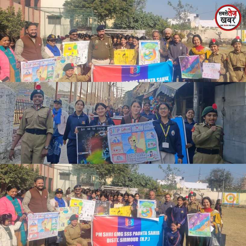 An anti-drug drive was organized by the NCC unit of PM Shri Kanya Senior Secondary School, Paonta Sahib, under the leadership of CTO Abha Rana. This awareness campaign was conducted in collaboration with the Paonta Sahib Police Department. During the program, SHO Paonta Sahib Kulwant Singh, ASI Kamal Kant, and PH Balwinder Singh provided detailed information to the students about the harmful effects of drugs and narcotics. They also shared the police department’s toll-free numbers, through which students can confidentially report any drug-related activities. The Principal and Block Project Officer M.R. Verma also sensitized the students about the dangers of drug abuse and its social and personal consequences. During the event, NCC cadets held a rally to spread the message of drug awareness among the local community. Other dignitaries present at the program included JP Tomar, Surender Chauhan, Kuldeep Thakur, Gulab Singh Thakur, Abha Rana, Kiran Chaudhary, and Vivekananda Sharma.