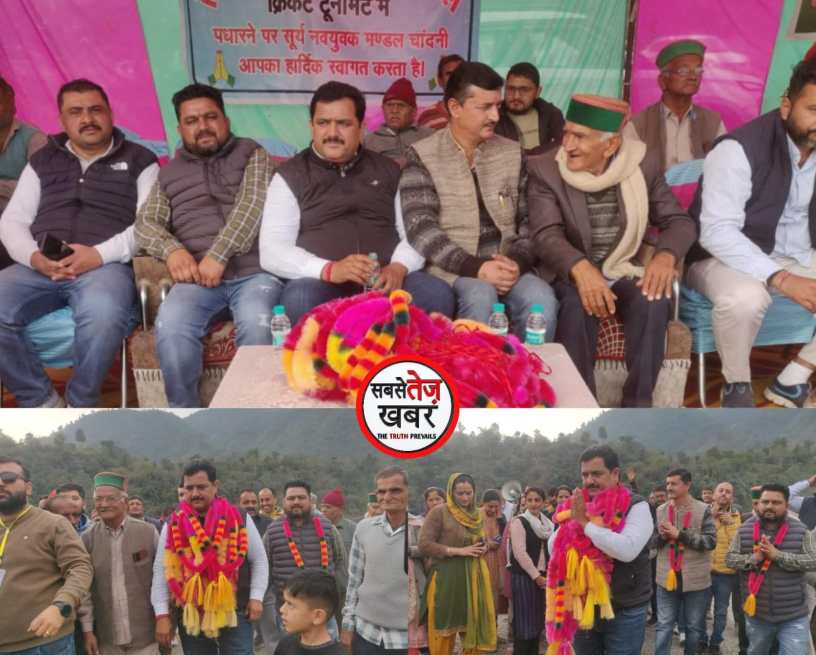 A grand celebration of the 6th Late Sanjay Thakur Memorial Rural Level Cricket Tournament was held in Chandni on December 13th. Approximately 128 teams from the region participated in this prestigious tournament, generating immense enthusiasm among cricket lovers. An attractive prize of Rs. 2 lakh was announced for the winning team and Rs. 1 lakh for the runner-up. The tournament was inaugurated by social worker and Youth Congress leader Manish Tomar. Upon his arrival at the venue, he was given a grand welcome with garlands and flowers by the members of the SNM Club. On this occasion, Manish Tomar congratulated the club for organizing the event in a disciplined manner and said that sports are the most powerful medium for the all-round development of youth.