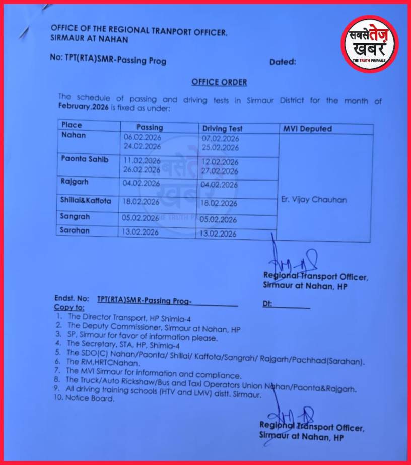 The Himachal Pradesh Transport Department has released the schedule for vehicle inspections and driving tests in Sirmaur district for February 2026. According to the information, vehicle inspections in Nahan are scheduled for February 6th and 24th, while driving tests will be held on February 7th and 25th. In Paonta Sahib, the inspection dates are February 11th and 26th, with driving tests on February 12th and 27th. In Rajgarh, both inspections and driving tests will be conducted on February 4th. Inspections and driving tests will be held in Shillai and Kafota on February 18th. In Sangrah, both will be conducted on February 5th. Additionally, inspections and driving tests will be held in Sarahan on February 13th. This information was provided by RTO Sona Chauhan. She urged vehicle owners to be present for their vehicle inspections and driving tests on the scheduled dates.