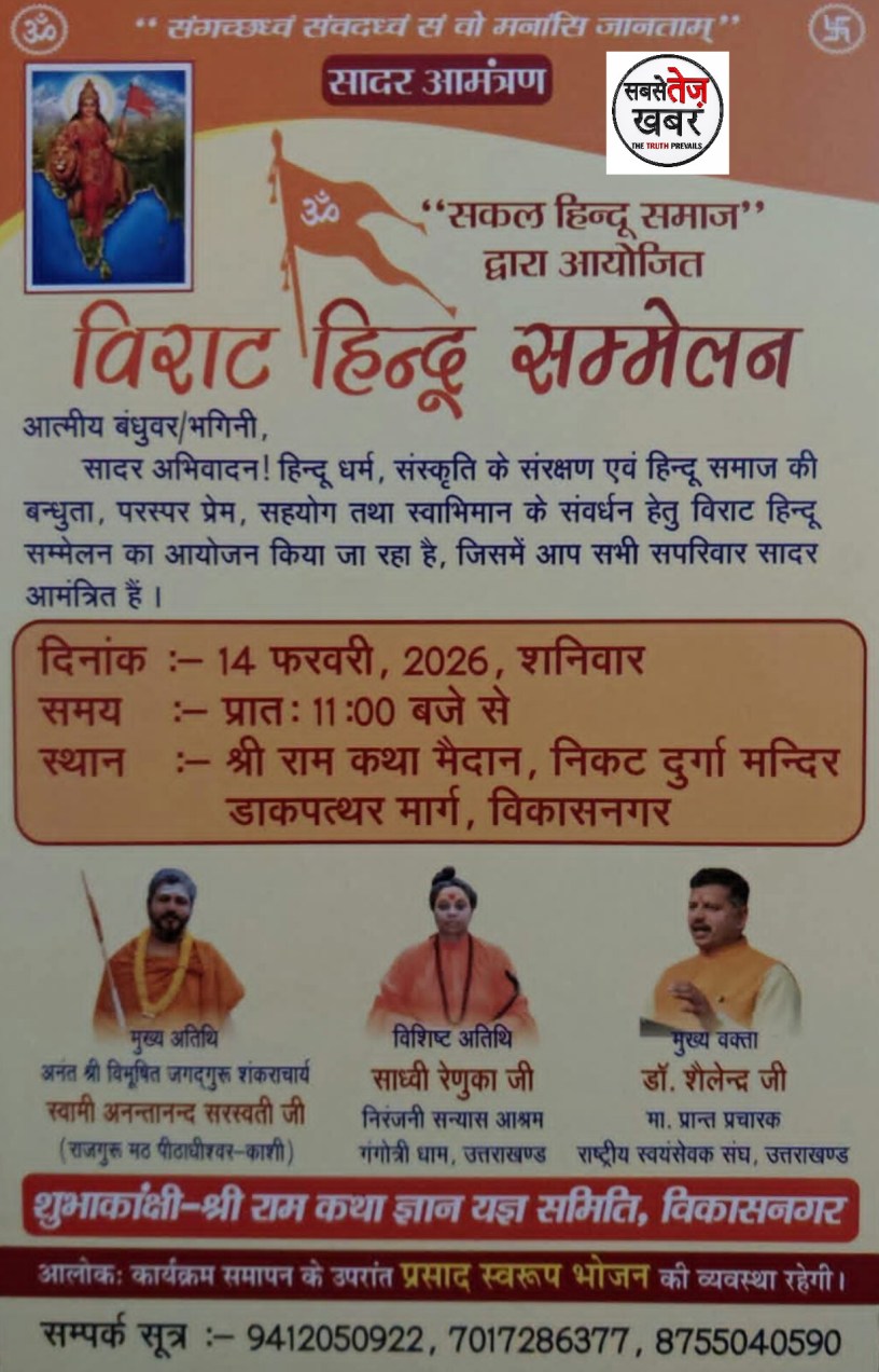 A grand event focused on the preservation of religion and culture is set to take place in Vikasnagar on February 14. A “Virat Hindu Sammelan” (Grand Hindu Conference) is being organized with the objective of strengthening brotherhood, mutual love, cooperation, and self-respect within Hindu society.