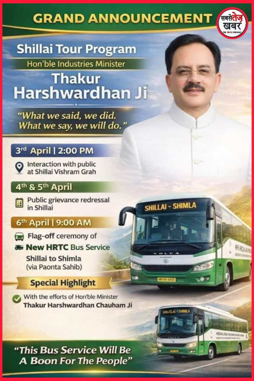 The highlight of the tour will be on April 6 at 9:00 am when the Minister will flag off the new HRTC bus service from Shillai to Shimla (Paonta Sahib Road). This new bus service is expected to provide improved transportation facilities to the people of the area. Minister Harsh Vardhan Chauhan stated that the promises made are being fulfilled and that development work will continue to be prioritized. He expressed confidence that this bus service will prove to be a major gift to the people of the region.