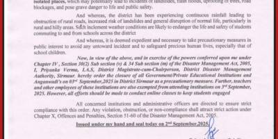 Sirmour: भारी बारिश का असर: 3 सितम्बर को सिरमौर के सभी स्कूल बंद, आदेश तोड़ने वालों पर गिरेगी गाज